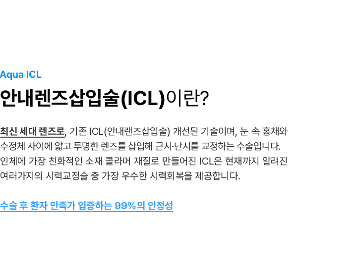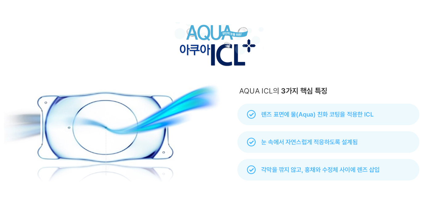 ICL은 별도의 관리 없이 눈 안에 삽입하여 반영구적으로 사용하도록 디자인된 특수 렌즈입니다.